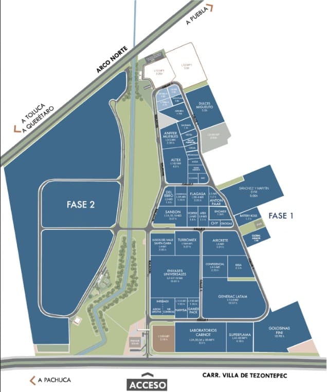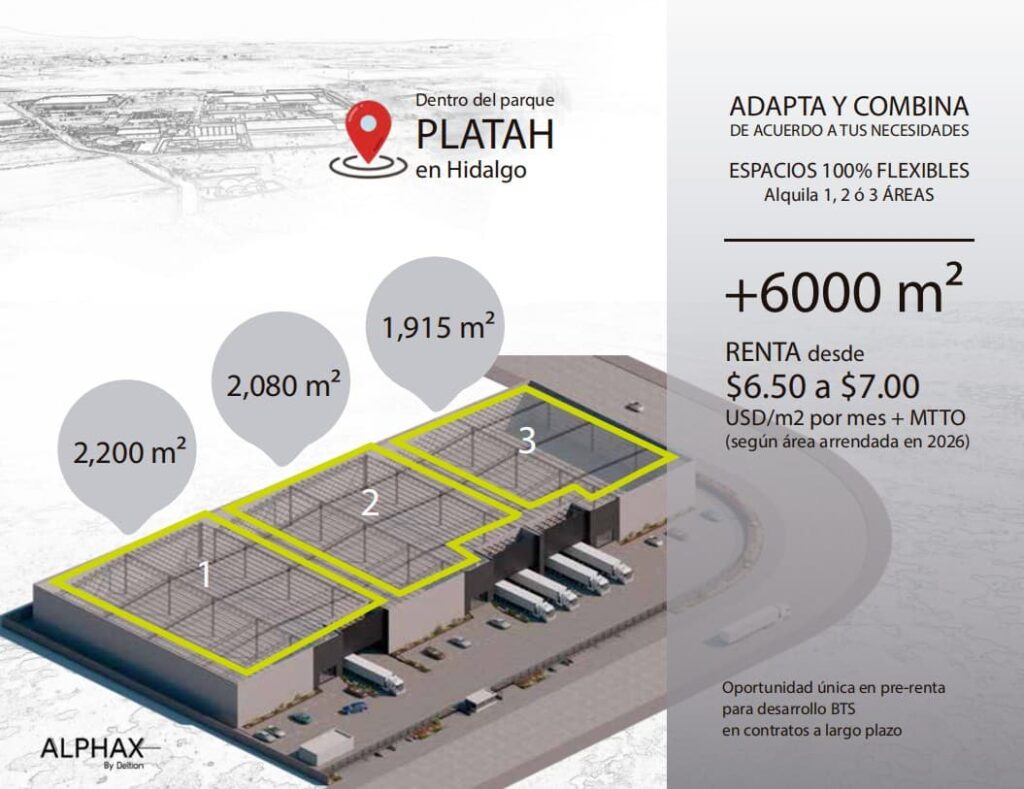 Descripción: El Parque Industrial PLATAH es un gran complejo de clase A en Villa de Tezontepec, Hidalgo, estratégicamente ubicado en el centro de México, cerca de la CDMX, con excelente conexión a puertos y grandes carreteras como Arco Norte, ideal para inversión nacional e internacional, ofreciendo infraestructura moderna, sustentable y servicios de primer nivel como para Centro de Distribución (CEDIS), Cadena de Suminitros, Logística y Manufactura, consolidando a Hidalgo como potencia industrial.